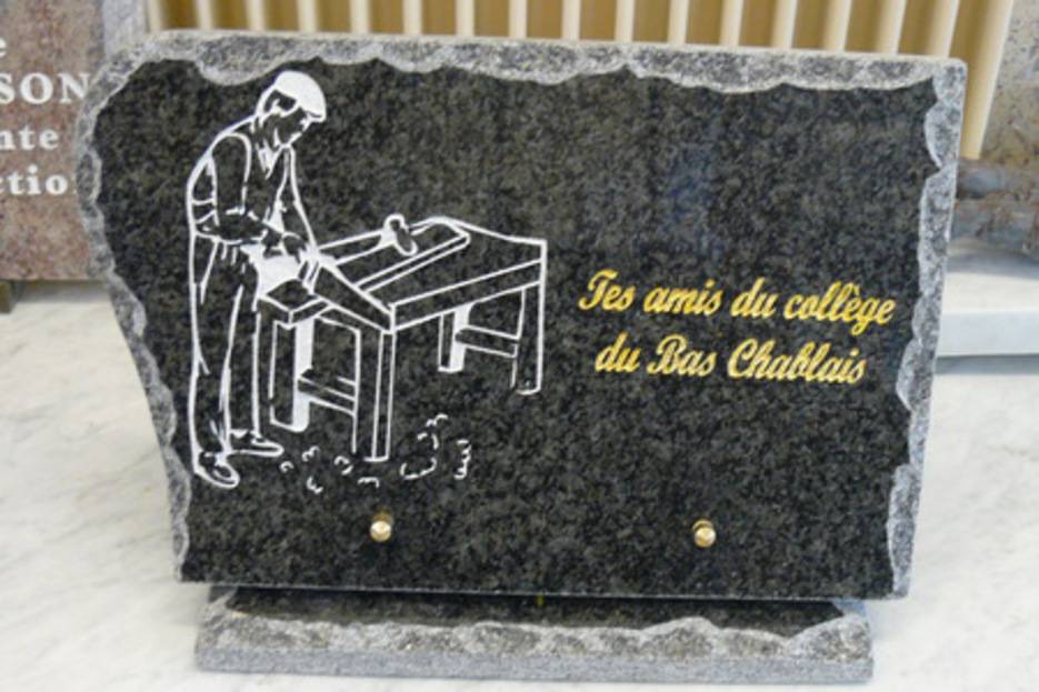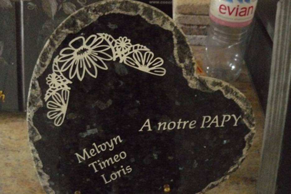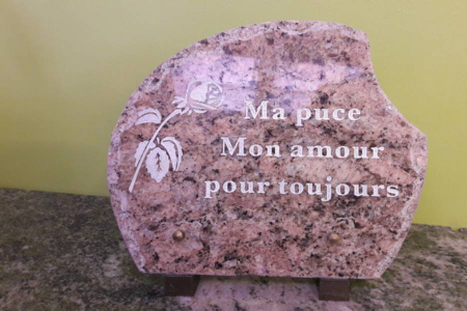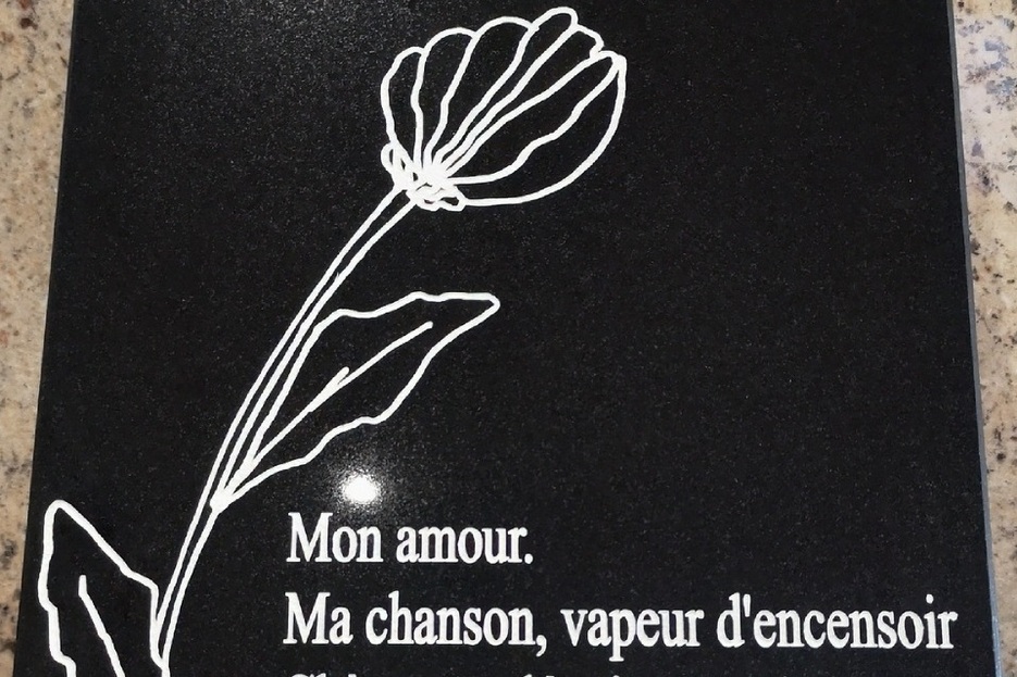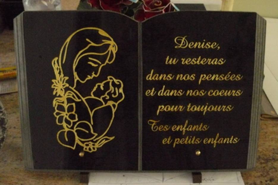 Pour vos besoins en marbrerie funéraire , nous réalisons sur demande des plaques personnalisées , texte, motif gravé